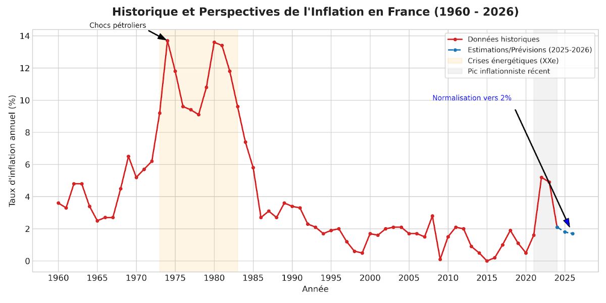 Graphique historique de l’inflation en France 1960-2026, montrant les pics des chocs pétroliers, la stabilité de la zone euro et la normalisation post-crise de 2022.